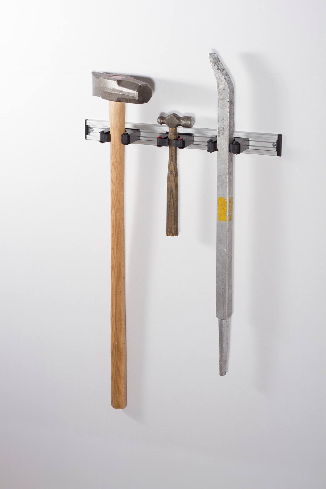 - Porte-outils mural ou sur rail pour ranger et organiser vadrouilles et balais, râteaux et pelles, quincaillerie, sports équipement et autres objets uniques