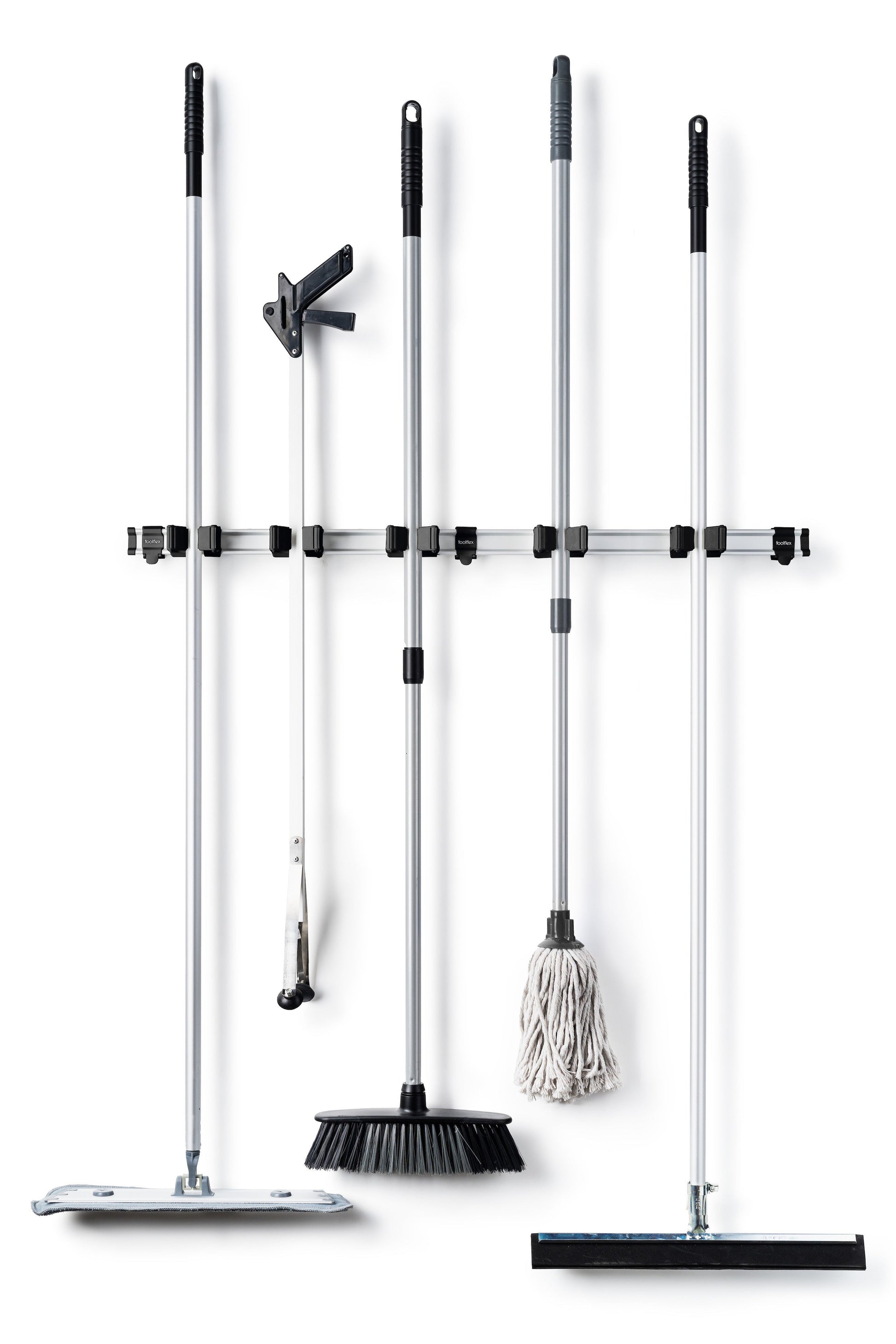 - The ideal mop and broom tool organizer to store, organize, quickly access mops and brooms, squeegees, dust pans, deck brushes, hand brushes and other uniquely shaped items